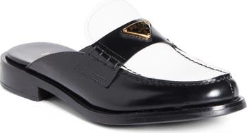 This penny loafer–inspired mule raised on a low block heel serves iconic style with triangular hardware and recalls classic Prohibition styles with black-and-white colorblocking.