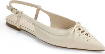 Lace-up detailing and a charming bow accent the instep of a pointy-toe slingback flat grounded by a cushioned footbed and rendered in supple leather.