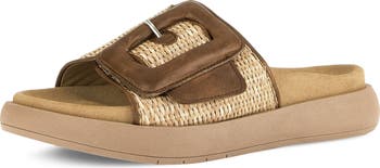 A contoured footbed and lightweight feel ensure lasting comfort in this handcrafted slide sandal topped with a woven strap.