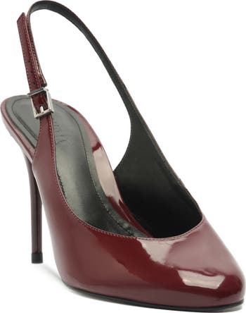 An almond toe and slender slingback strap create a streamlined profile on a glossy leather pump lofted by a sky-high stiletto heel.