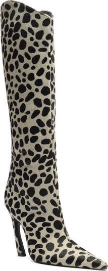 Complete your look with the bold, modern attitude of a leopard-spotted calf-hair boot that makes a high-impact statement down to the stiletto heel and pointy toe.