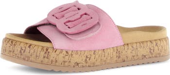 A decorative buckle tops the adjustable strap that offers this handcrafted leather slide sandal a custom fit. A cork midsole enhances the lightweight feel.