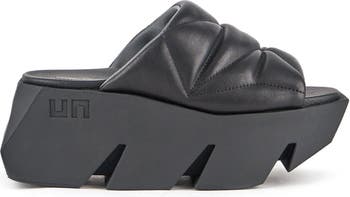 The Bull Puffy is a minimalist slide sandal with a puffy quilted leather upper and an abstract square toe shape. The bouncy foam rubber flatform outsole is defined by its voluminous, brutalist shape and is embossed with the iconic United Nude logo.