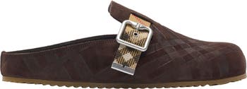 Soft suede embossed with tonal checks and an adjustable B-buckle strap—jacquard-woven with the Burberry Check—bring subtle brand recognition to this classic clog. A contoured footbed with logo lettering and a grooved sole molded with archival lettering keep the logomania going from the inside out, top to bottom.