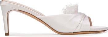 Round toe slipper mule with lace upper detail, set on a straight stiletto heel. Made with satin crepe.