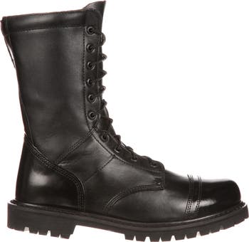 The exterior on this Rocky Men's Jump Boot has an adequate amount of durability and ruggedness so that it is able withstand the most unforgiving working conditions. The upper has been built from premium full-grain black leather. These 10-inch public service boots have a side zipper that aids in getting them on/off rapidly. In addition to these features, there is a polishable toe so that you can keep these boots looking like they are in tiptop shape. A great deal of the paratrooper boot's strength can be attributed to its welt construction. Eventually, all public service boots begin to wear down; with this construction, these boots can be repaired with no trouble and they revert back to their original hardiness. The contoured EVA footbed provides cushioning that will pacify your achy feet, and will make standing a much more comfortable experience. You will have more stability as a result of the stabilizer, because it is non-metallic you will not have to remove your footwear or be delayed around scanners or sensitive equipment. The black rubber lug outsole provides dependable traction; this is especially beneficial when you are walking on uneven terrain.