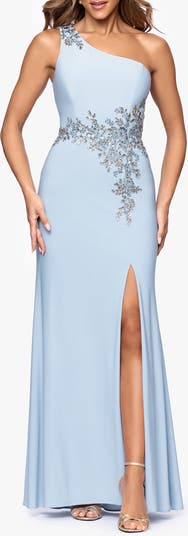 Feel your most striking in this floor-sweeping gown featuring a single bare shoulder, embellished soutache detailing and a soaring side slit.