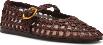 Woven raffia mesh brings natural texture to this breathable Mary Jane flat secured with an adjustable buckle strap.