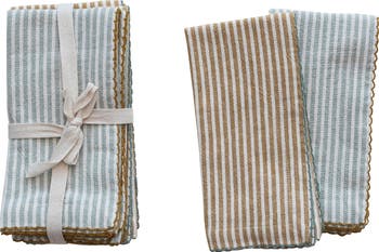 - This charming set of cotton napkins features a simple striped design and stylishly scalloped edge