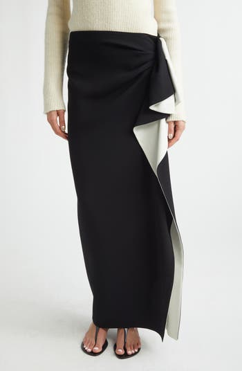 Following the seasonal theme of 'a soft undoing,' two-tone ruffles gracefully unfurl from the waistline of this fluid cady skirt, creating soft tension between color and form.