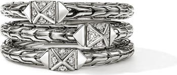 Brilliant pavé diamonds fill the staggered studs that add edge to this stacked ring hand-carved in the label's signature chain motif.