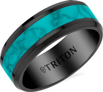 8MM Contemporary Black Tungsten Carbide Ring with Crushed Turquoise Inlay Center and Polished Beveled Edge Profile