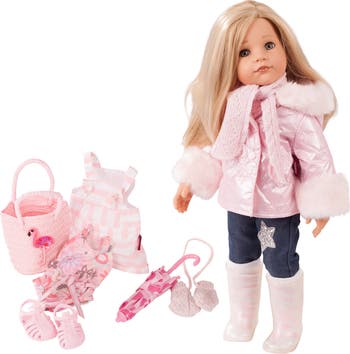 Hannah is happy as she is well equipped for any weather with this great set. When it's cold she wears her new winter jacket with plush on sleeves and hood and adds her knitted scarf and mittens. Your doll is very proud of this jeans with star made from sequins as it perfectly matches her pearly shimmering winter jacket. What do you think about these rubber boots? Transparent as you can see through the funny knee-highs. But be careful - everyone might see the holes also!In summer, Hannah wears her funny dungarees and rubber sandals. Her bathing suit and umbrella find space in this cute bast bag - you never know. You can still use it as sunshade if there is no summer rain. Hannahs purse has a beautiful flamingo made from sequins right where everyone can see it. What a great look!The highly expressive face appeals to any doll mommy. Hannah captures the heart of every little girl with her personality and charm. Every doll has a particular play theme and matching accessories. Hannah's play world will get children's hearts racing and encourage creativity. Hannah has long blonde hair and fixed stonegrey eyes.Hannah is part of the GOTZ handcrafted doll family, all of which are numbered and produced as limited editions under the highest quality standards. Her face was designed by notable doll designers. Every GOTZ handcrafted doll comes with a certificate of authentication and bears a GOTZ seal ribbon as a sign of quality. We only use high-quality hair with a natural appearance for these dolls. The hair is sewn into the doll's head and is very durable. Children can easily wash, style and comb it. See product information. There is almost no limit to your child’s imagination.