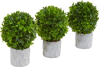 Coming in a set of three, these boxwood artificial mini topiaries go great with any decor. Their small, dense green leaves and round shape ensure they will brighten up any room they are placed in. Place them around your favorite short vase of faux flowers and use the arrangement as a coffee table centerpiece.