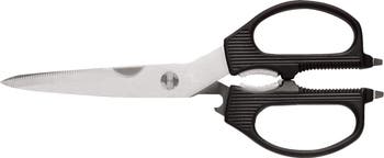 You will be amazed at the many uses for our multi-purpose shears—from opening packages to trimming flowers. There's a built-in nutcracker, a jar opener, a bone notch, a lid lifter, and even two screwdriver tips, one in each handle. They're great for tightening a loose screw in the kitchen cabinet without having to go to the garage to find a screwdriver. Shun Multi-purpose Shears have one blade serrated so they can easily cut through even tough or fibrous materials. The blades separate for easy cleaning, then lock together easily and securely for use.