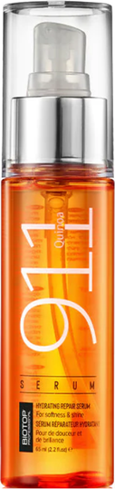911 Quinoa Serum is a lightweight, non-greasy, leave-in styling serum that helps hydrate, smooth and revitalize all hair types, leaving hair looking and feeling healthier and softer. Nourishing proteins and amino acids from Quinoa and Sunflower Seed Oil seal each hair’s cuticle to help restore hair’s natural strength and shine while reducing the appearance of frizz and split ends. KEY BENEFITS • Easily penetrates & fills nutrient-depleted cuticles • Seals the cuticle layer, locking in moisture • Reduces the appearance of split ends & breakage • Smooths the cuticle layer & reduces frizz • Hydrates & softens • Adds shine • Provides heat & UV protection • Lightweight & non-greasy formula • Color-safe • SLS, SLES, Paraben, Sodium Chloride & Cruelty-free KEY INGREDIENTS Quinoa • Helps restore cuticle strengthening proteins & amino acids • Restores vitamins & nutrients • Promotes healthy hair growth Sunflower Seed Oil • Deeply moisturizes • Adds shine • Adds UV protection Vitamin E • Strengthens hair to reduce breakage • Increases luster & shine • Softens Hair & adds elasticity WHO IT’S FOR For dull, dry or lightly stressed hair to repair and restore moisture, shine, manageability and overall hair health. HOW TO USE • Pre Blow Dry: Apply two + pumps into palms depending on hair length. Distribute evenly throughout damp hair. Blow dry & style as desired • As a finisher on dry hair: Work a small amount into the mid to ends of the hair to control frizz, smooth, and style