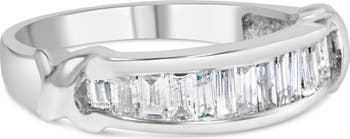 Elegant and timeless, this rhodium-plated .925 sterling silver diamond band features 0.5 carat total weight of baguette cut diamonds channel set and anchored on both sides by an elegant cursive style X. The flat style band has a high shine, polished finish and measures ⅛” or 3mm wide. The ring features a whopping 21 natural, untreated white diamonds in all. This ring makes a great engagement ring, anniversary ring, promise ring, or statement ring, as well as a great gift for those with April birthdays! Diamonds are thought to give the wearer clarity and illuminate solutions to life’s problems, as well as encouraging abundance, strength, courage, harmony, faithfulness, and commitment. Give her a gift that will last forever.