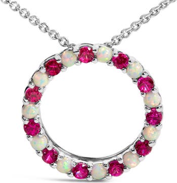 .925 Sterling Silver Alternating Created Red Ruby and Opal Circle Pendant Necklace