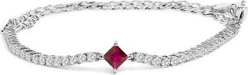 Embody elegance with this enchanting .925 sterling silver tennis bracelet, rhodium-plated for an everlasting gleam and supreme durability. Designed to dazzle, it features a regal 4x4 mm princess-cut ruby at its heart, surrounded by mesmerizing 2x2 mm white sapphires, each perfectly poised in a classic four-prong setting. These lab-created gems, known for their precise cut and breathtaking brilliance, offer a sustainable luxury, color-treated to achieve their vibrant hues. The innovative adjustable design with a lobster claw clasp seamlessly adjusts from 6.25 inches to 9.25 inches, ensuring a flawless fit for any wrist. The duality of sparkling gemstones and a sleek mesh chain blends sophistication with comfort, making this bracelet a versatile addition to any jewelry collection.