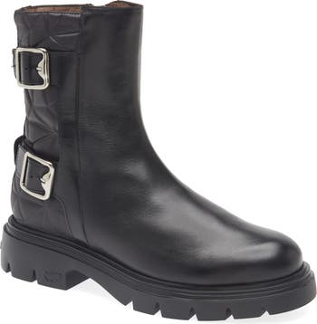 An edgy leather bootie set on a lugged sole gets gleam from a pair of buckles and comfort from memory gel cushioning and an extralight sole.