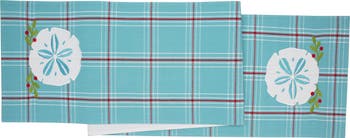 Celebrate the season with a classic coastal holiday look. C&F Home's Coastal Holiday applique tabletop collection features a coastal blue background with a simple red and white plaid, perfect for adorning your holiday table. An applique sand dollar surrounded by holly berries and leaves add the perfect touch of festive cheer.