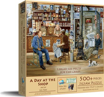 Indulge in the timeless charm of a bygone era with the SunsOut "A Day at the Shop" 500 Piece Jigsaw Puzzle. Inspired by the artwork of Les Ray, this masterpiece transports you to a quaint shop full of friendship and warmth, making it the perfect relaxing pastime for adults. Proudly made in the USA, each puzzle ensures top-quality and durability with seamless, interlocking pieces crafted from high-quality recycled cardboard. The finished puzzle, which measures 19.25" x 26.625", makes a perfect display item, showcasing SunsOut's commitment to sustainability through the use of eco-friendly soy-based inks and premium recycled board. Its vibrant, rich colors stem from fully licensed artwork, offering an environmentally friendly and visually stunning pastime. With SunsOut’s dedication to excellence and a worry-free guarantee resolving any issues with missing or damaged pieces promptly, puzzle enthusiasts can trust in the quality of their product. SunsOut, a woman-owned small business, pridefully celebrates American artistry and craftsmanship, providing an opportunity to not only entertain but to support local artists and communities. Come, unlock your inner puzzler with the SunsOut "A Day at the Shop" jigsaw puzzle - your pathway to relaxation, enjoyment, and a celebration of American ingenuity.