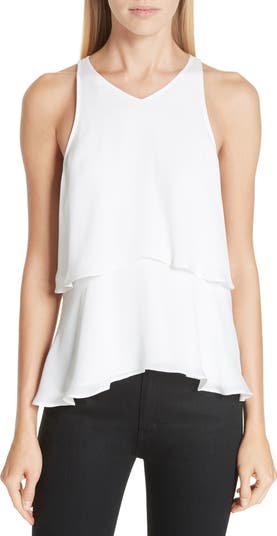Two tiers create fluttery movement and ease on this silk tank before slightly flaring over the hips. Cutaway shoulders reveal the perfect amount of skin.