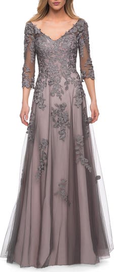 A-line style long lace gown with gray lace and pink lining. The dress features sheer three quarter sleeves and a V neck and back. Back zipper closure.