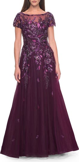 A-line tulle mother of the bride gown with short sleeves. The dress features stunning beaded sequin lace applique throughout the top and skirt. Back zipper closure.