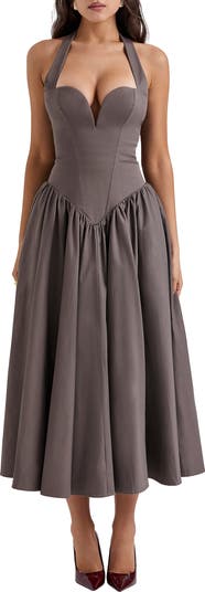 A flirty halter neck refreshes the look of a midi-length dress complete with a pleated, tulle-lined skirt.