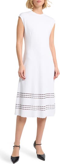 Scalloped stripes make an elegant statement on this cap-sleeve knit dress in an A-line silhouette.