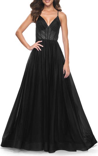 Elegant a-line tulle prom dress with ruching detail on the bodice. V neckline and lace up open back. The waist features exposed boning. Back zipper closure.