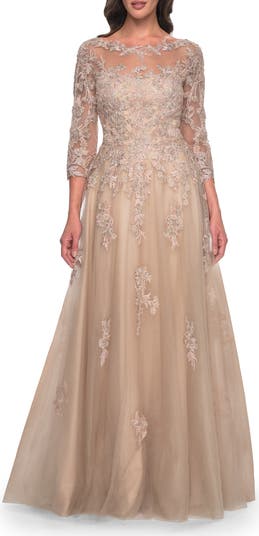 La Femme A-Line Tulle and Lace Applique Gown with Lace Sleeves, Main, color, Champagne