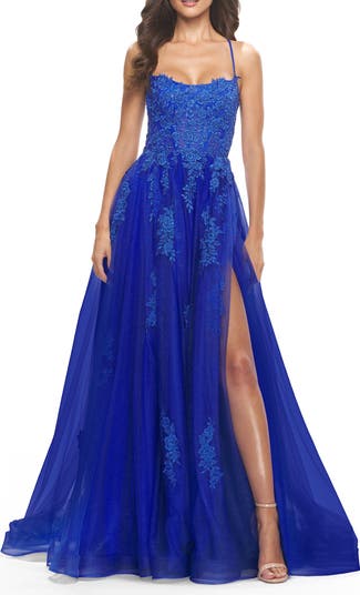 Feminine A-line tulle ball gown with gorgeous cascading floral lace embroidery. Scattered rhinestones give this design added sparkle. Features a side slit and criss-cross lace up back. Back zipper closure.