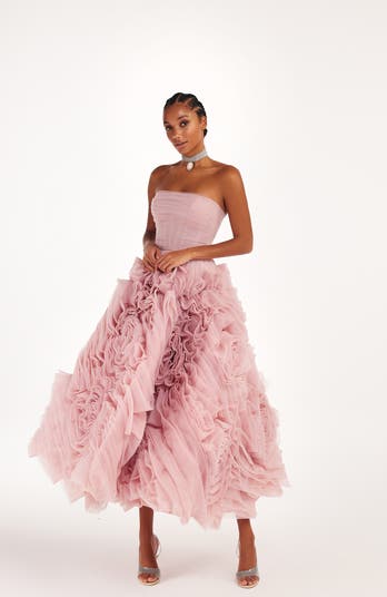 Crafted for elevated events and special celebrations, this misty pink tulle midi dress blends romantic volume with event-ready elegance. A structured bodice with subtle support and delicate 3D floral detailing creates a feminine, polished silhouette, balanced by a flowing skirt that feels light on the body. Ideal for evening attire, weddings, and upscale parties, it brings together refined design and graceful movement.