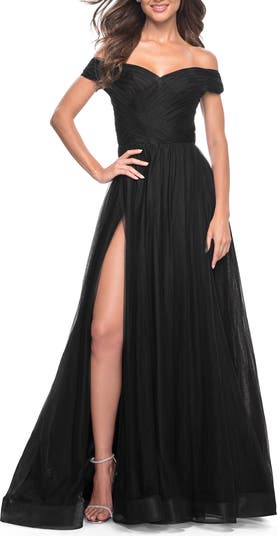 Off the shoulder prom dress with tulle a-line skirt. The top features detailed ruching and an illusion waist and back. Back zipper closure.