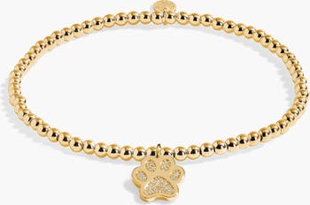 Gift gorgeously and celebrate you furry friends with the A Little 'Love Has Four Paws' Bracelet In Gold-Tone Plating from A Littles & Co. Created in gold-tone plating, this style features a beaded design to fit every wrist and is threaded with an adorable sparkling paw print-shaped charm. Wrapped around a stylized card, framed with a heartfelt poem, it's oh-so special!