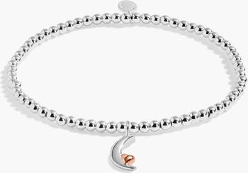 The A Little 'Love You To The Moon & Back' Bracelet from A Littles & Co. features an enchanting design that shines with every movement. Threaded with silver-plated beads and a sweet moon charm, this little style comes wrapped around a stylized card, framed with a heartfelt poem. It's oh-so special!