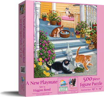 Explore a captivating world of feline wonder with the "A New Playmate" 500-piece jigsaw puzzle by SunsOut, a masterpiece exquisitely brought to life by acclaimed artist Higgins Bond. The vibrantly detailed artwork transports you to an enchanting scene of amicable animals and their curious cat companions, challenging you to assemble a picturesque 19"x19" masterpiece. Beyond providing adults an entertaining diversion, SunsOut puzzles promise a satisfying puzzle-solving experience free from frustration due to their meticulously crafted interlocking pieces that fit seamlessly into place. Using high-quality eco-friendly materials, each SunsOut puzzle is made from recycled cardboard and printed with soy-based inks in the USA. The puzzles not only support eco-conscious initiatives but also celebrate the successful woman-owned small business. The puzzles are precision-cut and feature random-shaped pieces for an engaging challenge, using fully licensed artwork from top artists to ensure quality and authenticity. SunsOut stands by its commitment to excellence, offering a hassle-free warranty and vigilant customer care if any pieces are missing or damaged. Embark on a creative escape with "A New Playmate", a charming animal-themed puzzle that brings joy and creativity into your space, granting relaxation and rejuvenation.