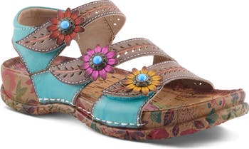 A laser-cut and hand-painted leather upper embellished with floral appliquès highlights the artisanal design of this strappy sandal fitted with a cushioned, anatomically contoured cork insole.