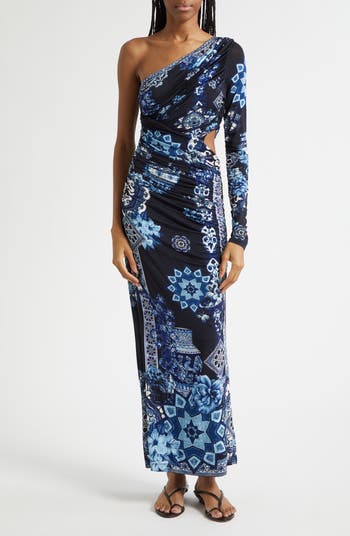 A rounded waist cutout reveals a sultry flash of skin in this curve-contouring jersey dress, where Camilla's hand-set diamanté sparkles shimmer across a limited-edition print—a tribute to the ornate tilework found throughout Seville.