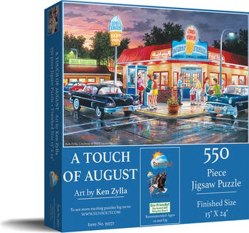Step back in time with SUNSOUT INC's charming 550-piece jigsaw puzzle, "A Touch of August." This masterpiece captures the essence of simpler times in classic Americana, with a completed size of 15" x 24". Designed by renowned artist Ken Zylla, each premium, interlocking piece offers fun and satisfaction. Crafted from durable, high-quality recycled cardboard, these puzzles are both environmentally friendly and easy to handle. Proudly made in the USA, SunsOut stands by its exceptional quality and commitment to customer satisfaction, offering a worry-free guarantee for missing or damaged pieces. By choosing SunsOut, you're supporting a proud, woman-owned business that values quality craftsmanship and American-made goods. With artwork fully licensed, you're not just putting a picture together but a vibrant, artistic, licensed creation. For lovers of classic vehicles and nostalgic scenes, this puzzle isn't just a delightful challenge; it's a snapshot of history and a celebration of the art of puzzle-making. So experience the joy of assembling "A Touch of August" and add a touch of vintage elegance to your collection today.