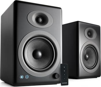 - Clear, precise and powerful audio that fills any room, the award winning A5+ system has been recognized as having Audiophile-quality sound at an unbeatable price. Analog class A/B power amplifiers with dual analog audio inputs for connecting multiple devices at once. The A5+ system features true stereo sound in hand-finished wood cabinets, 5" custom aramid fiber woofers and 0.75" silk dome tweeters. Control volume using the remote control or the front mounted knob, and save power when not in use with an auto-sensing sleep mode. Experience room filling sound from a small footprint with 150W of combined peak output. Easily connect the compact Audioengine S8 or S6 subwoofer via the RCA variable output. And at 10.75”H x 7”W x 9”D ea, the A5+ Home Music System sound much bigger than they are.