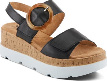 Adjustable vamp straps lend easy wear to a slingback leather sandal set on a cushioned footbed and chunky platform wedge.
