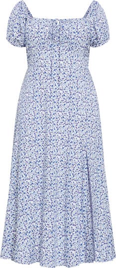 An Empire waist and smocked back create a foreshortened and fitted bodice on this floral-print midi made a bit flirtier by a convertible elasticized neckline and sultry side slit.