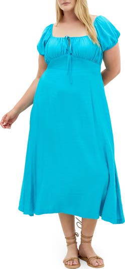 A shirred bust shapes this romantic midi peasant dress styled with short puff sleeves that can be worn on or off the shoulder. A subtle keyhole tie details the front, while a smocked back ensures a comfortable fit. A flared skirt completes the easy silhouette.