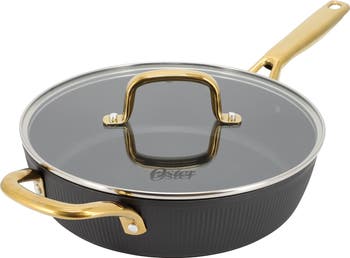 The Oster Abbottsford 4 Quart Nonstick Aluminum Sauté Pan with Glass Lid in Black is the perfect blend of style, durability, and functionality for any kitchen. Crafted from high-quality aluminum, this sauté pan provides excellent heat distribution, ensuring even cooking and reducing hot spots. The nonstick interior allows for effortless food release and easy cleanup, making it ideal for searing, sautéing, pan-frying, and simmering. Its sleek matte black finish adds a modern touch to your cookware collection, while the sturdy construction ensures long-lasting performance for everyday cooking. Equipped with a tempered glass lid, the Oster Abbottsford sauté pan allows you to monitor your cooking without lifting the lid, helping retain heat and moisture for flavorful results. The comfortable, heat-resistant handles provide a secure grip, making it easy to maneuver from stovetop to table. With its generous 4-quart capacity, this sauté pan is perfect for preparing family meals or cooking in larger batches. Whether you're browning meats, reducing sauces, or stir-frying vegetables, this versatile sauté pan brings convenience and efficiency to your kitchen.