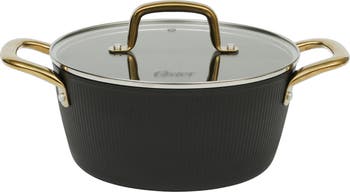 The Oster Abbottsford 7 Quart Nonstick Aluminum Dutch Oven with Glass Lid in Black is the perfect blend of style, durability, and functionality for any kitchen. Crafted from high-quality aluminum, this Dutch oven provides excellent heat distribution, ensuring even cooking and reducing hot spots. The nonstick interior allows for effortless food release and easy cleanup, making it ideal for preparing soups, stews, braised dishes, and more. Its sleek matte black finish adds a modern touch to your cookware collection, while the sturdy construction ensures long-lasting performance for everyday cooking. Equipped with a tempered glass lid, the Oster Abbottsford Dutch oven allows you to monitor your cooking without lifting the lid, helping retain heat and moisture for flavorful results. The comfortable, heat-resistant handles provide a secure grip, making it easy to transfer from stovetop to table. With its generous 7-quart capacity, this Dutch oven is perfect for preparing family meals or batch cooking your favorite recipes. Whether you're slow-simmering a hearty dish or braising tender meats, this versatile Dutch oven brings convenience and efficiency to your kitchen.