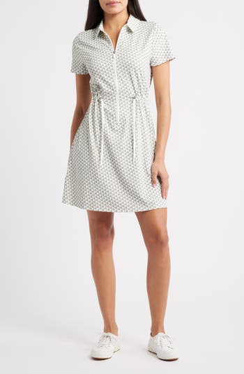 Drawcord ties cinch the waist of this palm-printed shirtdress made with sun-protected moisture-wicking fabric for all-day play.