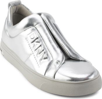 Logo embossing adds a flash of signature style to this silvery slip-on sneaker.